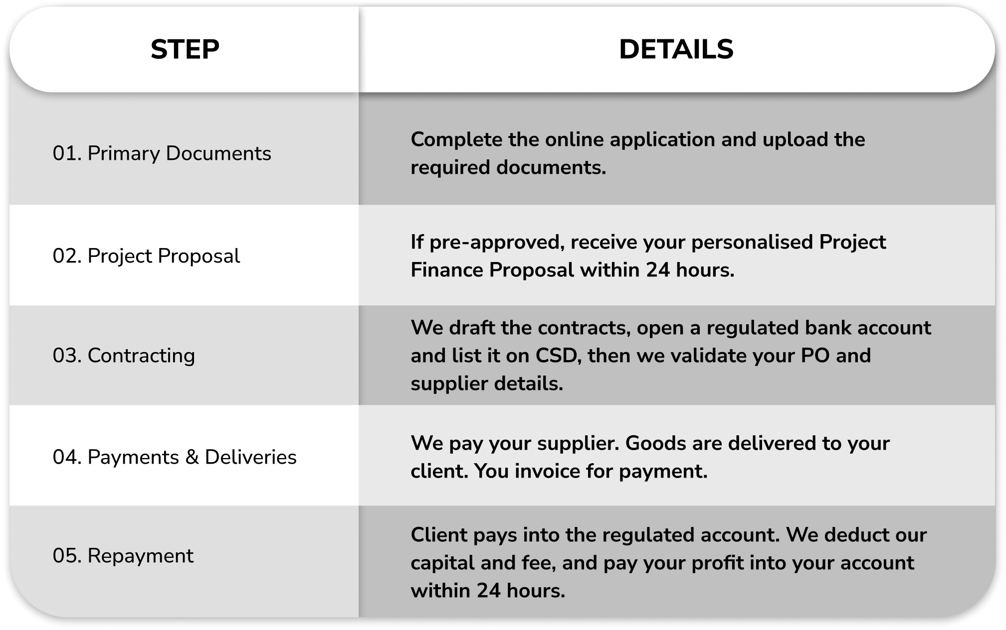 Got a confirmed PO from the government, a parastatal, or a big corporation but don’t have the capital to deliver? That’s where we step in.